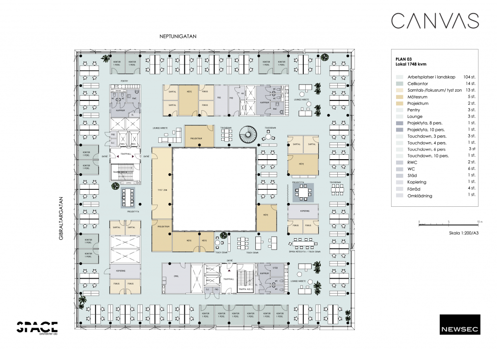 Vi har nu möjligheten att erbjuda hela 1748 kvm på ett och samma våningsplan i Canvashuset. Kontorslokalerna har generöst med ljusinsläpp från stora fönsterpartier i flera vinklar. Det går även att expandera till ett annat våningsplan via en interntrappa - mycket smidigt. Har man en organisation som skulle föredra olika entréer och kanske även olika adressmöjligheter finns det även ingångar från olika trapphus.