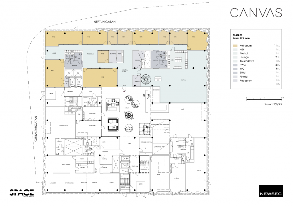 Kontorslokalerna har generöst med ljusinsläpp från stora fönsterpartier i flera vinklar. Totalt kan vi erbjuda 3 950 kvm som är helt sammanlänkat och att nästan kunna få 2 000 kvm av dessa på ett och samma våningsplan är unikt. Självklart finns här interntrappor att nyttja om man smidigt vill gå mellan olika våningsplan. Skulle man hellre föredra att separera avdelningarna så finns det naturligtvis också entréer från de vanliga trapphusen.